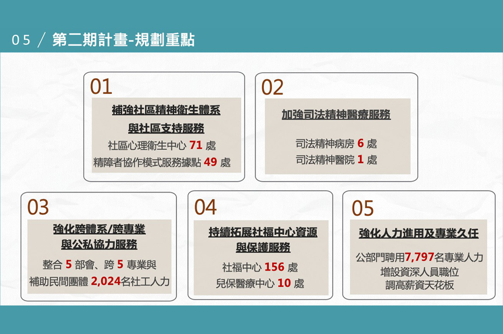 強化社會安全網第二期計畫有五大重點:一、補強精神衛生社區體系與社區支持服務,設置社區心理衛生中心71處及精障者協作模式服務據點49處;二、加強司法精神醫療服務,設置司法精神病房6處及醫院1處;三、強化跨體系、跨專業與公私協力服務,整合各部會、專業與結合民間團體推動25項方案;四、持續優化社福中心資源與保護服務,設置社福中心156處及10家兒少保護醫療整合中心;五、強化人力進用及專業久任,增設資深人員職位,強化職涯發展,調高各類人員薪資天花板,提升久任意願。