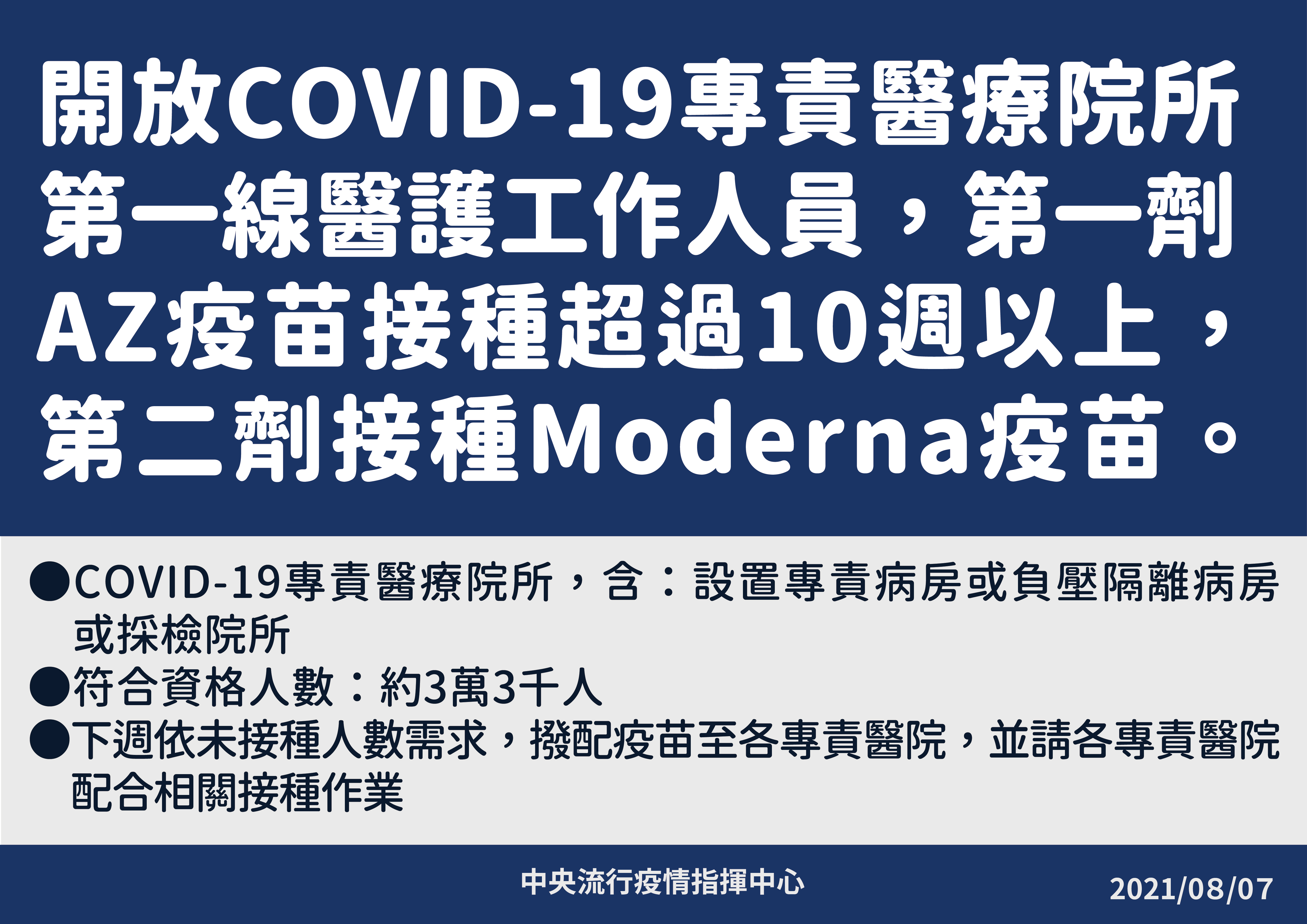 指揮中心開放「COVID-19專責醫療院所」第一線醫護人員,且第一劑AZ疫苗接種滿十週以上者,第二劑可混打莫德納疫苗。