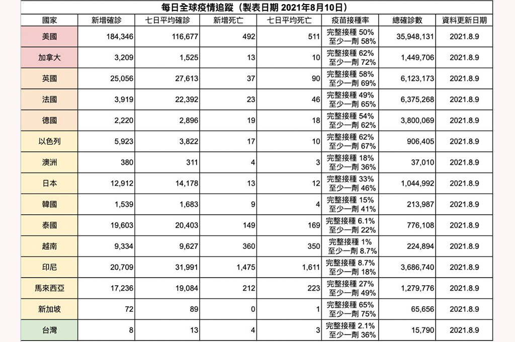 根據公開數據統計,截至8月10日,美國疫苗完全接種率已達50%,但每日新增確診人數卻是十幾萬上下。台灣能夠在全球疫情嚴峻的情況下,同時圍堵本土疫情又防住Delta入侵,實屬不易。
