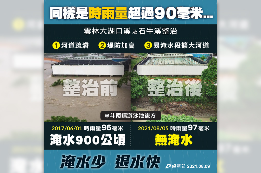 經濟部今(12)日於行政院會報告「0806水災現況與復原-水災現況」,並於會後記者會指出,近期豪雨累積降雨較以往更多,但淹水區域較少,且退水更快,顯示過去治水成果確實大幅降低淹水災害。經濟部表示,前瞻基礎建設水環境計畫,是因應現況治理不足及未來需要的重要計畫,「今天不做,明天會後悔」。