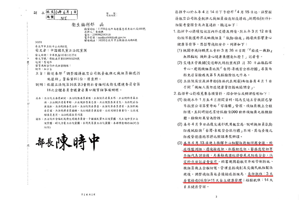 費鴻泰今日上午在記者會上拿出衛福部今年5月27日給國民黨團的回函指出,該份文件提到,「本年4月13日晚上指揮中心相關任務組研商會議,經疫情監測組、邊境檢疫組、社區防疫組、醫療應變組等各組代表討論後,為兼顧我國經濟發展及防疫安全,決定於次日記者會宣布,調整機組員返台後檢疫措施為,長城航班:3天居家檢疫(採陰)+11天自主健康管理;短程航班:14天自主健康管理」。他強調,文件清楚載明參與決策的組別,陳時中事後也說該會議由他所主持,怎麼會沒有會議紀錄?