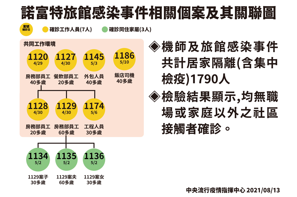 至於華航諾富特群聚案,有7位工作人員、3位同住家人確診。機師加上旅館的事件,包含後來在4月底飯店清空,機師和旅館員工全數轉移至集中檢疫的412人,總計採檢1790人,皆無職場、家庭以外的社區接觸者確診。