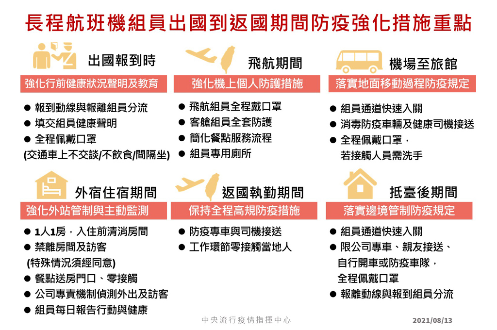 陳時中於今日例行記者會上表示,去年12月31日前機組人員執行長程飛行任務,為「3+11」防疫規範。3天居家檢疫+11天自主健康管理,空服員則為5天居檢+9天自主健康管理;若為短程飛行任務則一律是14天自主健康管理。由於當時有紐西蘭機師造成的本土案例,因此進行滾動式修正,同時配合秋冬專案,從今年1月1日起至3月11日改為「7+7」,改為長程採7天居檢(須採陰)+7天加強自主健康管理,短程則是14天自主健康管理。