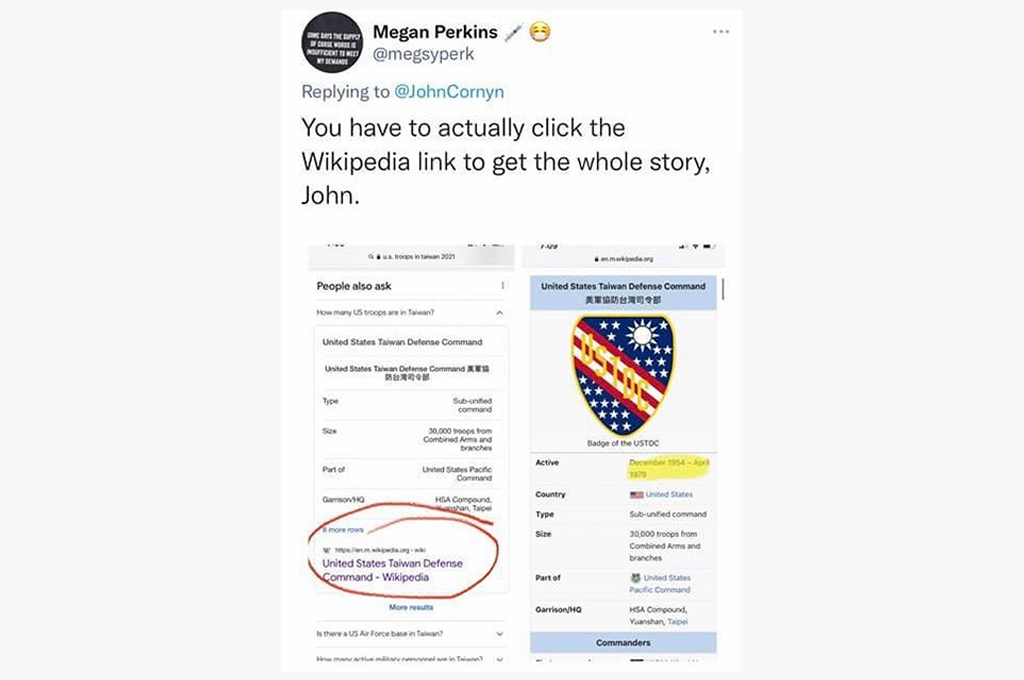 有網友貼出維基百科網頁表示,康寧可能是只看了相關的數字,但沒有注意到時序,美軍駐台3萬人應該是指1954至1979年期間,台美斷交後,美軍就已逐步撤離台灣,目前應只有少數美軍派駐AIT,保護人員安全。