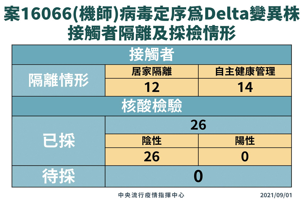 中央流行疫情指揮中心今(1)日宣布,近期國際COVID-19之Delta變異株疫情持續嚴峻,其傳播力強、發病時病毒量高,且國外頻傳完整接種COVID-19疫苗後突破性感染案例;又因日前一名長榮航空機師,案16066因打過兩劑疫苗且滿十四天後仍「突破性感染」,因此將從9月15日零時起(航班抵臺時間)加強機組員的返台檢疫規定。