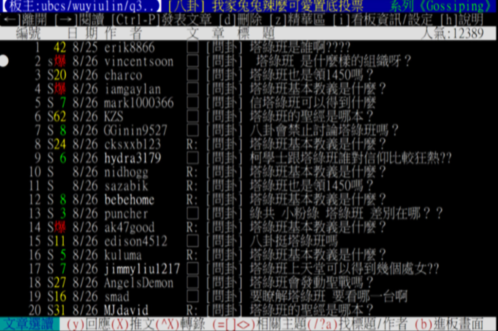接著在8/26開始,八卦版上出現大量的「塔綠班」相關文章。無巧不巧的是,8/26也是各大媒體爆出韓國瑜好兄弟黃文財,加入民眾黨擔任「媒體總監」的時候。這個時間點的巧合,不禁讓人懷疑,「塔綠班」事件的操作,是否是新任的網路將軍的火力展示。