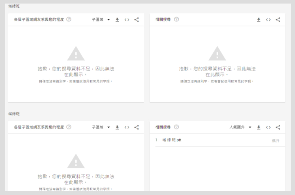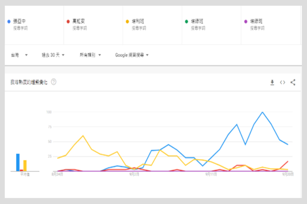 即使是網路上的文字討論,「塔綠班」也沒有引領起甚麼風潮,只在小圈圈同溫層(民眾黨支持者)內部風行。從google的搜尋趨勢可見,過去30天裡,不管是「塔綠班」還是「塔綠斑」,關鍵字搜尋的顯示資料不足,就算是口出惡言的高虹安,搜尋熱度也不高,遠遠比不上「張亞中」或正牌的「塔利班」。