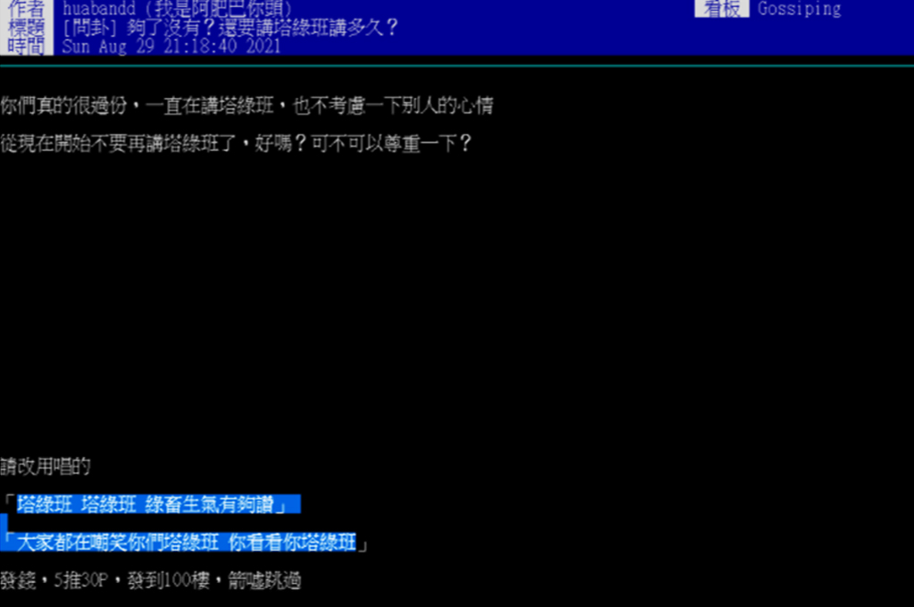 「塔綠班,塔綠班,綠畜生氣有夠讚。大家都在嘲笑你們塔綠班,你看看你塔綠班。」這句改編自綠油精廣告曲(改編自英國兒歌)的歌詞,可以追溯到8/29八卦版的發文,發文者寫了這段詞,也沒有說曲子是甚麼。(底下網路留言提醒,這是綠油精的廣告配樂,自導自演的意味濃厚。)並且發送p幣(ptt論壇上使用的虛擬貨幣)來協助推廣。