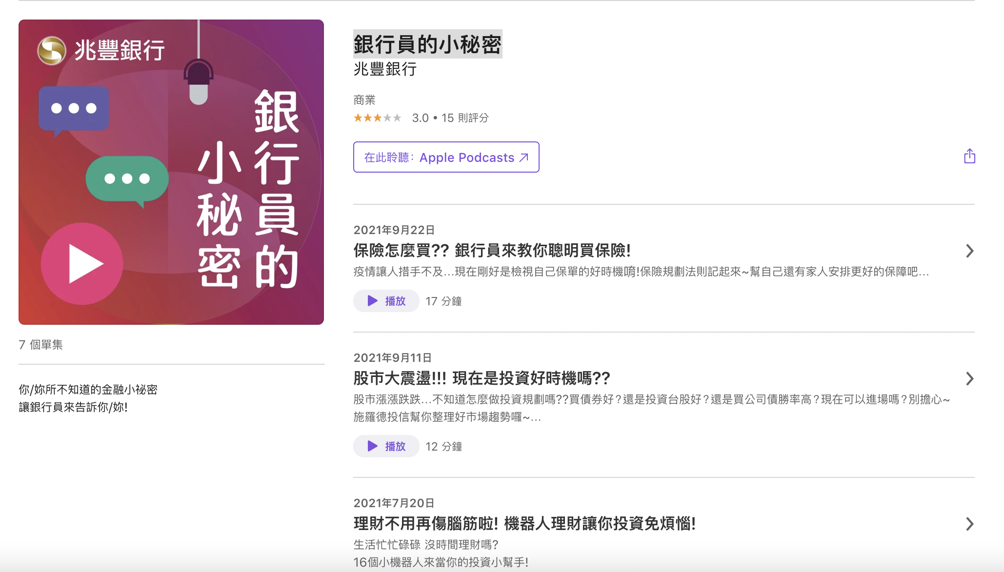 兆豐銀行為貼近年輕族群的心,看準未來發展性,搶先佈署數位媒體社群行銷,「銀行員的小秘密」Podcast頻道以實用性的主題內容,搭配口語化的對白,帶領小資族群輕鬆進入金融專業領域。