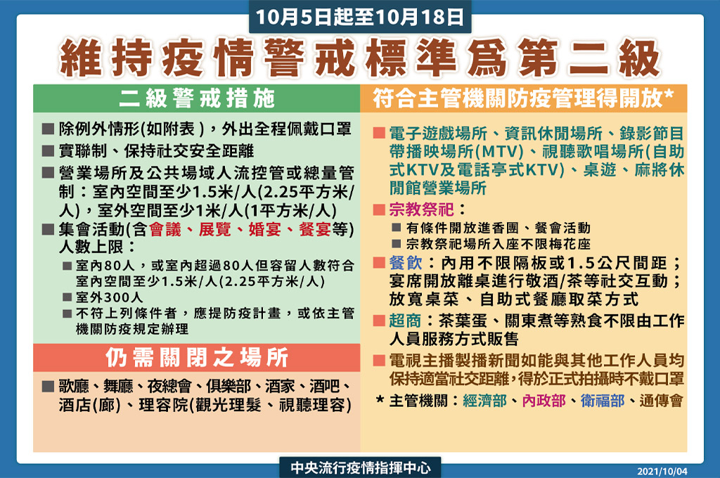 考量國內疫情已趨緩並且穩定控制,經與相關單位溝通討論及評估後,中央流行疫情指揮中心今(4)日宣布,自今(2021)年10月5日至10月18日維持疫情警戒標準為第二級,調整相關規定及原則說明如下: