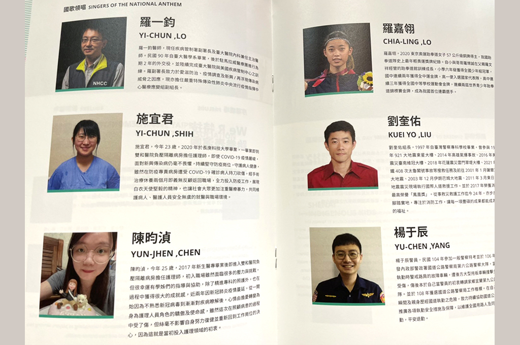 根據慶籌會規劃,國慶典禮的國歌將由防疫、運動、警、消領域的6位英雄代表,包括羅一鈞、羅嘉翎、護理師施宜君與陳昀湞、消防員劉奎佑、警員楊于辰,偕同國立客家兒童合唱團共同領唱;同一時間,國軍契努克運輸直升機,也將吊掛歷年最大國旗,在阿帕契與眼鏡蛇直升機伴隨下飛越總統府前廣場上空