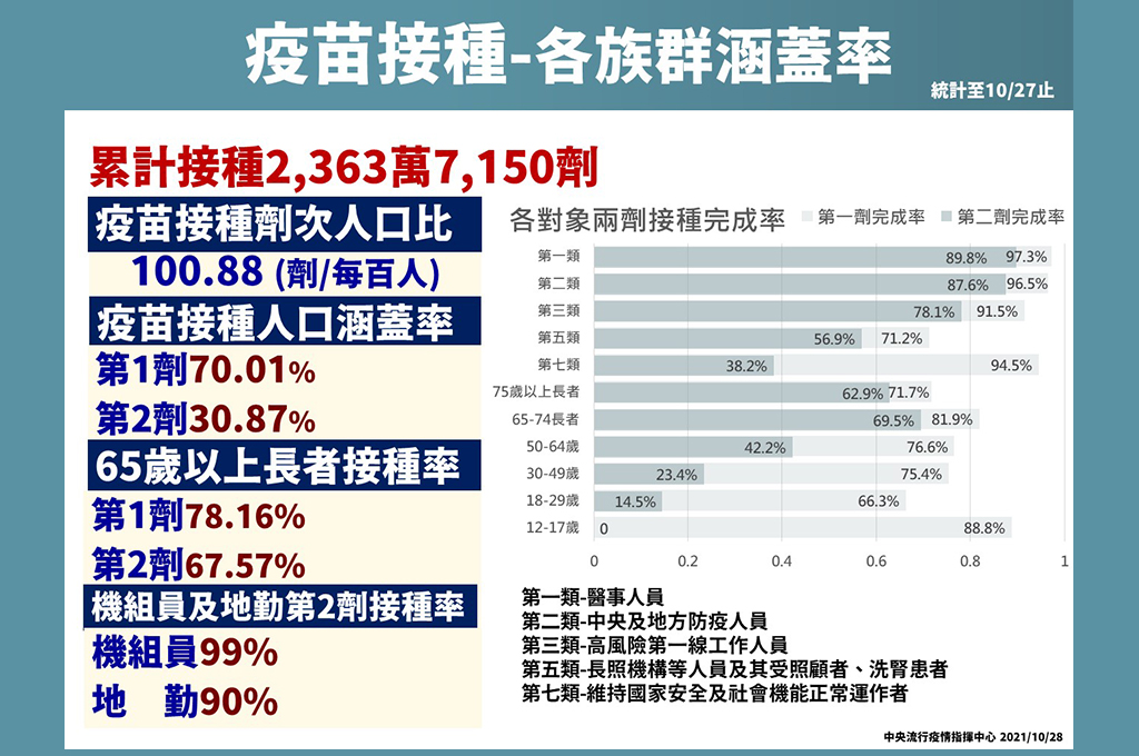 中央流行疫情指揮中心今(28)日表示,截至10月27日止,我國第一劑疫苗涵蓋率已達70.01%、第二劑已達30.87%,劑次人口比達到每百人100.88劑,全國已接種約2363.7萬人次,提前達成接種目標。同時,指揮官陳時中表示,今日上午民間企業購贈的BNT已到貨,明天也會再到一批。