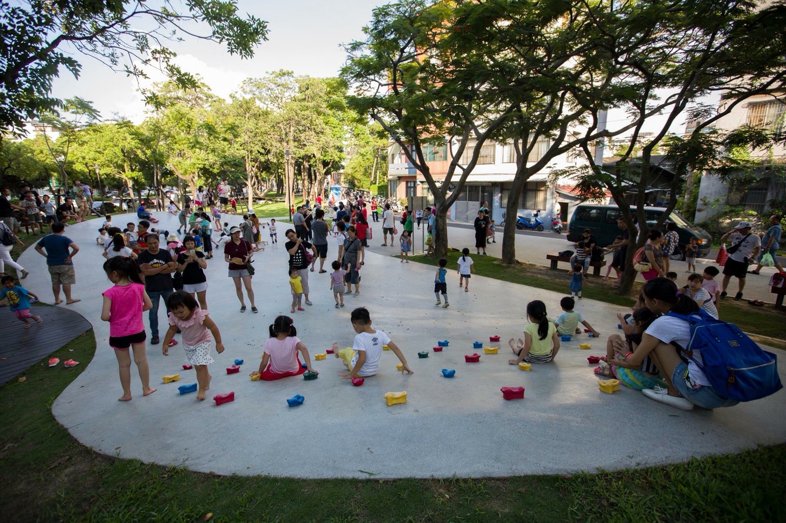 再來,中央公園同樣數十年老樹蔓生、陰暗幽微,入夜乏人問津,市府大幅修整,邀專家重新打造、專業修樹、拆除小圍牆,揚棄舊式的塑膠遊具,引入共融式多元遊樂設施,如今已成新竹市親子最愛的一個遊戲區;僅一街之隔的「隆恩圳藍帶親水區」,邀請國際知名台灣建築師黃聲遠規劃,打通巷弄,整闢林園與步道,近800公尺的城市綠廊,晨昏滿是民眾散步、運動與親子遊憩的人潮,即便晚夜9、10點,依然能見社區民眾全家聚會、散心。