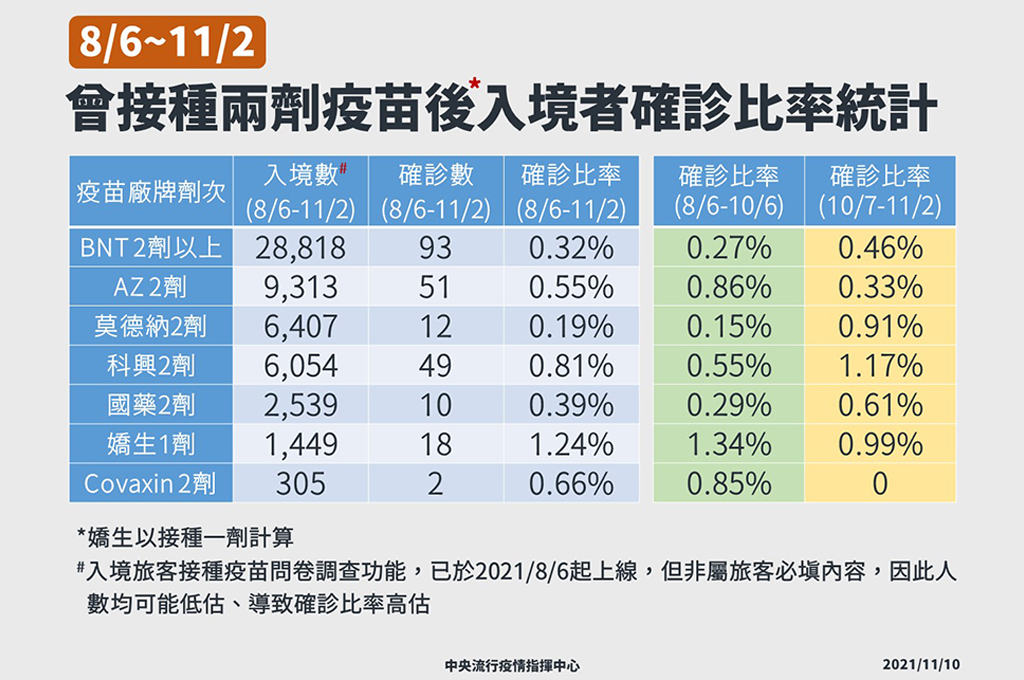 全球各國的疫苗施打政策都進行了一段時間,因此指揮中心公布自8月6日起,提供入境旅客選填疫苗施打狀況。經過回收問卷後,指揮中心統計出入境旅客施打疫苗廠牌以及突破性感染比率。