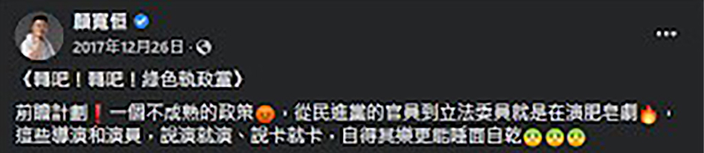 批評政府是在野黨立委的權責,用詞苛薄也無可厚非,但如果還要假裝自己問政敦厚,那就是看不起選民的記憶力。2017年12月26日顏寬恒臉書說「轉吧!轉吧!綠色執政黨」、「民進黨官員在演肥皂劇」、「導演和演員說演就演說卡就卡,自得其樂更能唾面自乾。」極盡嘲諷之能事。