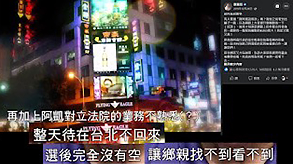 最離譜的是,這隻影片還直接抹黑陳世凱說:「再加上阿凱對立法院的業務不熟悉(?)整天待在台北不回來,選後完全沒有空,讓鄉親找不到看不到。」影片畫面直接放了酒店的街景跟配上歌舞音樂,抹黑陳世凱「缺乏專業」、「選後會在台北夜夜笙歌不務正業」。