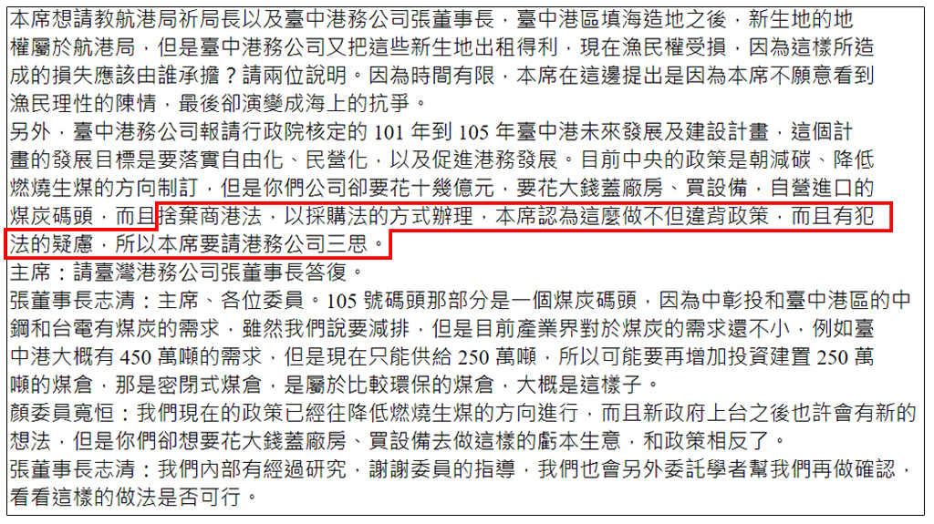 顏寬恒質疑,政策已經往降低燃燒生煤的方向進行,而且新政府上台之後也許會有新的想法,但港務公司卻想要花大錢蓋廠房、買設備去做這樣的虧本生意,和政策相反。