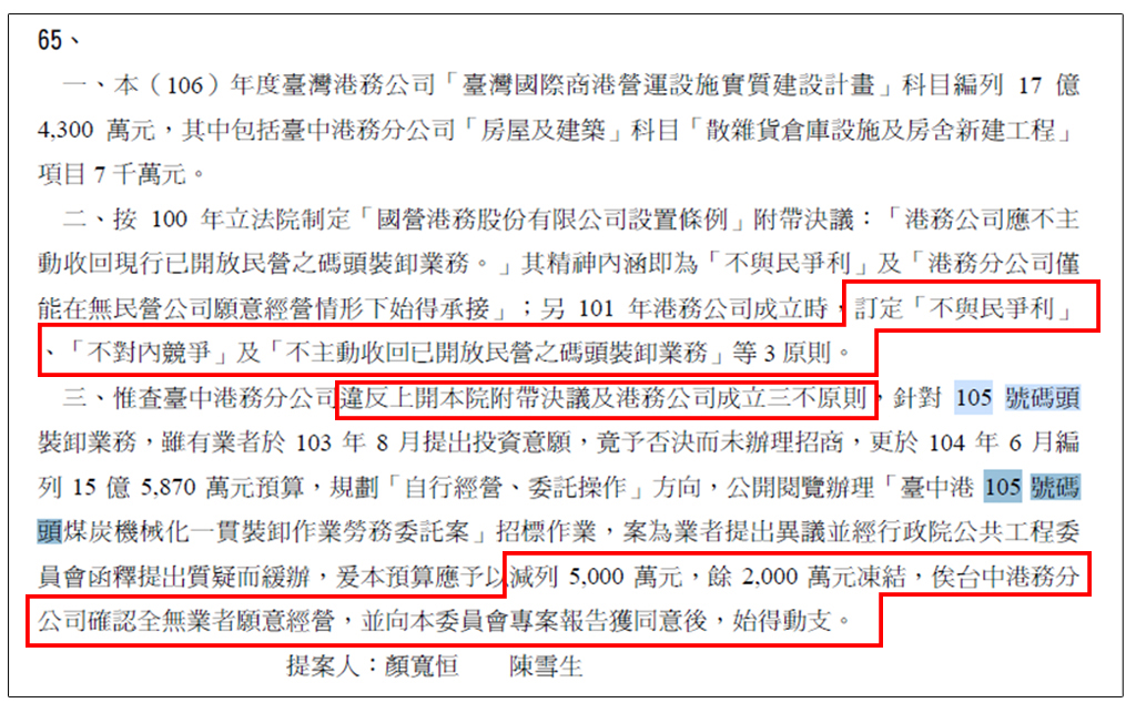 顏寬恒提案指出,台中港務分公司違反上開本院附帶決議及港務公司成立三不原則,針對105號碼頭裝卸業務,雖有業者於103年8月提出投資意願,竟予否決而未辦理招商,更於104年6月編列15億5870萬元預算,規劃「自行經營、委託操作」方向,公開閱覽辦理「臺中港105號碼頭煤炭機械化一貫裝卸作業勞務委託案」招標作業,案為業者提出異議並經行政院公共工程委員會函釋提出質疑而緩辦,爰本預算應予以減列5000萬元,餘2000萬元凍結,俟台中港務分公司確認全無業者願意經營,並向本委員會專案報告獲同意後,始得動支。