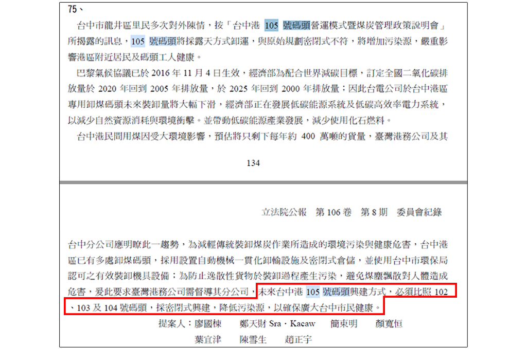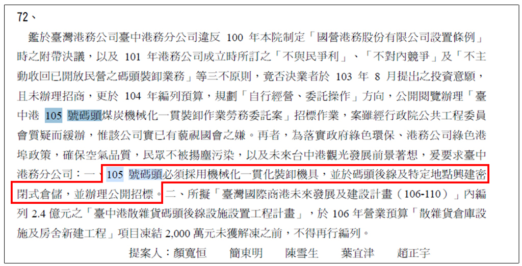提案指出,為防止逸散性貨物於裝卸過程產生污染,避免煤塵飄散對人體造成危害,爰此要求台灣港務公司需督導其分公司,未來台中港105號碼頭興建方式,必須比照102、103及104號碼頭,採密閉式興建,降低污染源,以確保廣大台中市民健康。