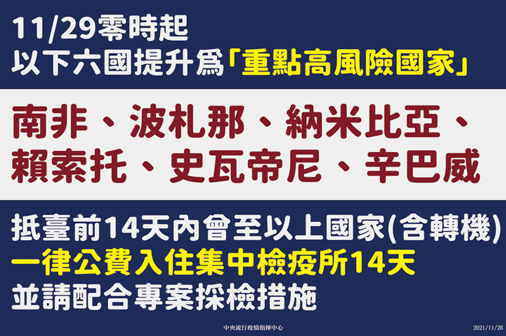 因應「B.1.1.529」變異株在全球引起的威脅,指揮官陳時中今日記者會上表示,自11月29日零時起,南非、波扎納、納米比亞、賴索托、史瓦帝尼、辛巴威等6國列入為「重點高風險國家」。凡旅客抵台前14日內曾至以上國家,轉機亦同,一律公費入住集中檢疫所14天,不適用「7+7」等春節入境專案。