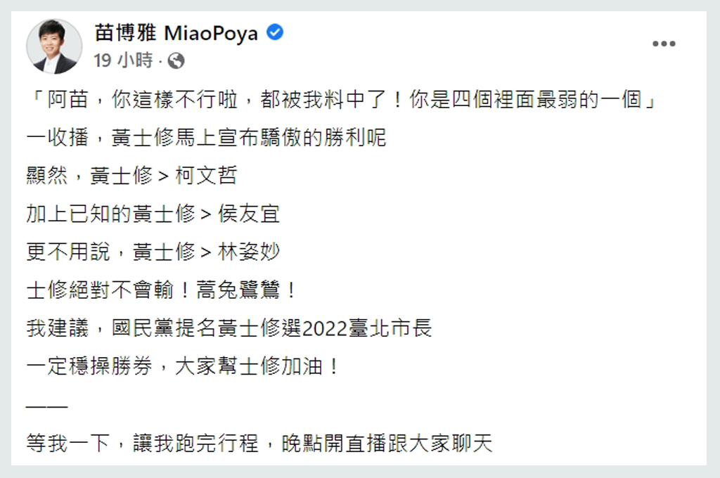 公投說明會結束後,黃士修馬上嗆聲,「阿苗,你這樣不行啦,都被我料中了!你是四個裡面最弱的一個。」苗博雅將這番互動貼上臉書與網友分享,更呼籲國民黨:「提名黃士修選2022臺北市長,一定穩操勝券,大家幫士修加油!」