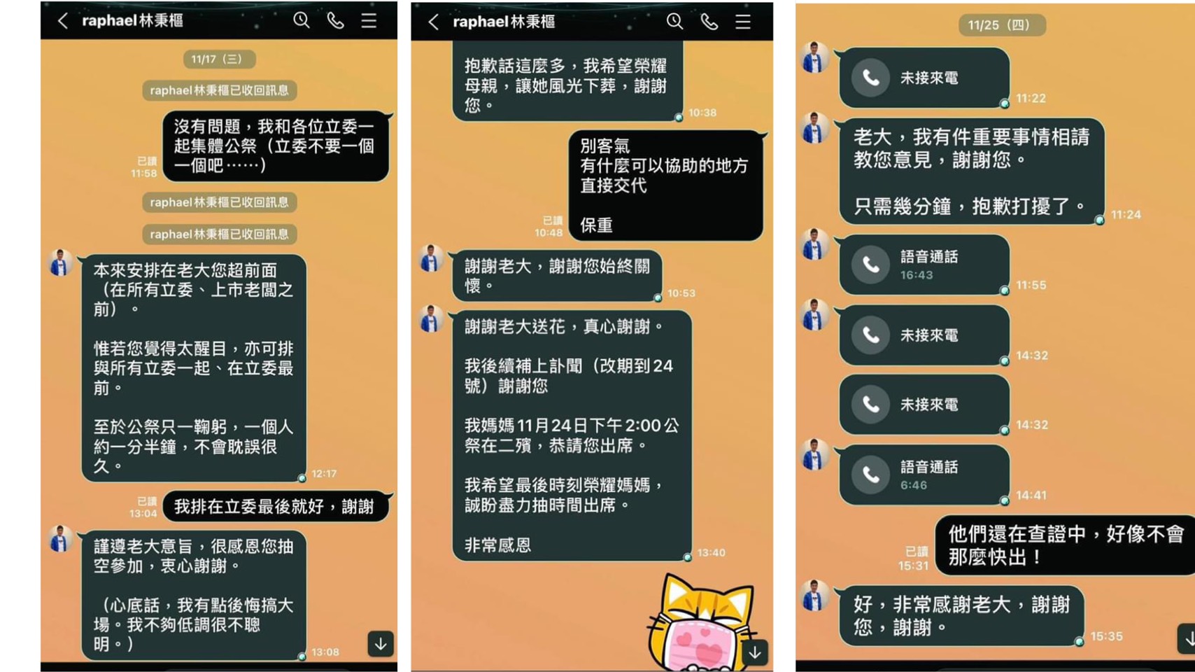 上週三(11月24日)段宜康應邀參加林母的告別式,現場人很多,而他特別注意到有幾位員警在門口。沒想到隔天,林秉樞就急著找段宜康,前前後後幾通電話講了3個重點:「一、他(林男)說有警察是因為馬文鈺去告別式鬧場,發傳單說他打高嘉瑜;二、週刊拍到他和高嘉瑜一前一後進旅館,但沒有其他畫面;三、因為他不希望出名,高嘉瑜又是新聞焦點,如果週刊一定得報導,可不可以不要在他母喪剛辦完的這個時候;他的名字是不是可以不要出來?」