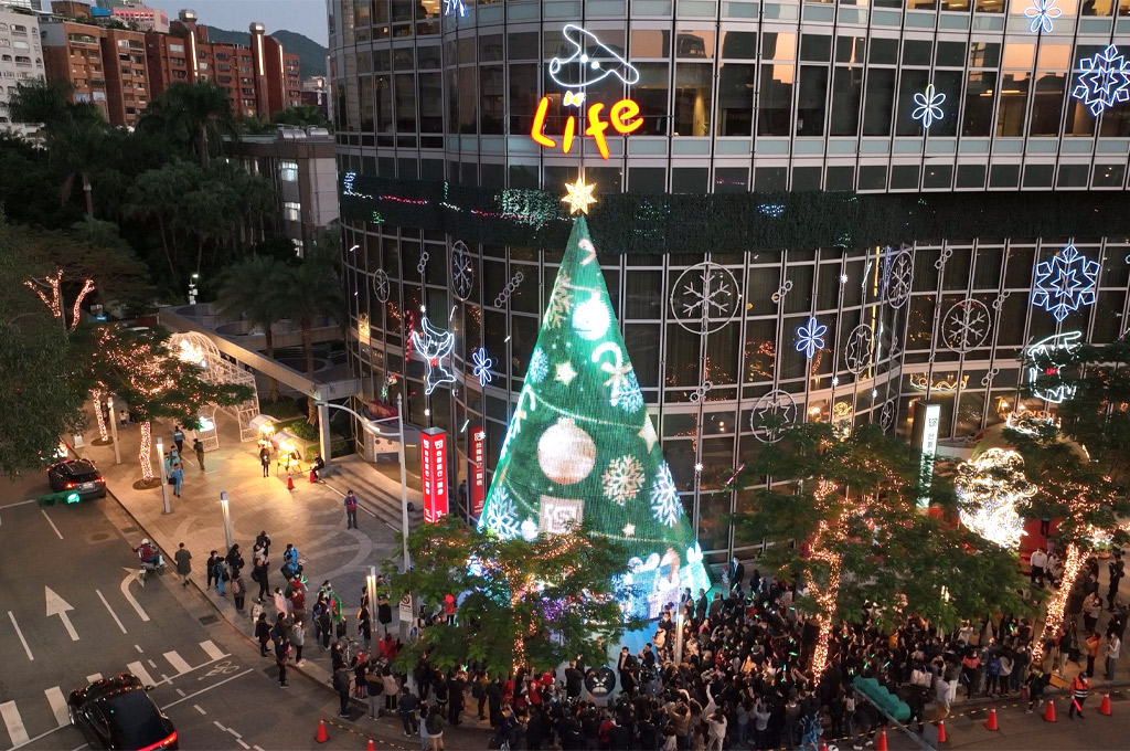民眾引頸期盼的聖誕佳節即將到來,台新金控延續「愛(i)」的精神,於12月3日在臺北市仁愛圓環旁的總部大樓舉行聖誕樹點燈儀式。在台新金控董事長吳東亮的帶領下,現場的台新金控同仁、眷屬以及逾百位的週邊鄰里大小朋友們一起高聲讀秒倒數,齊喊「點亮幸福 讓愛閃耀」,用愛共同點亮15米高的全LED燈聖誕樹。透過數萬顆LED燈泡呈現出精心設計華麗又富含聖誕氛圍的3D特效動畫,將金控大樓妝扮成為仁愛圓環區域最美的聖誕打卡景點。同時,於聖誕樹旁的光廊城堡內,佈滿了圓環周邊商戶及台新生活金融生態圈合作夥伴們的商標,全臺共3,000多家商戶共襄盛舉推出聖誕優惠,民眾用Richart Life APP即可輕掃QR Code拿取各式優惠。
