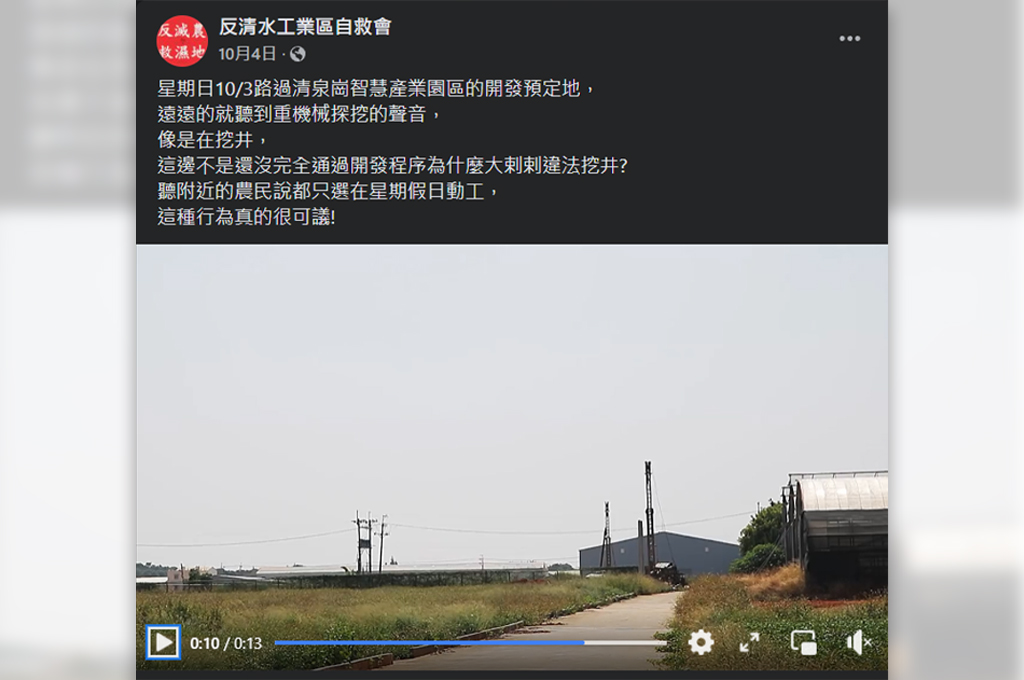 更驚恐的是,環評還沒聽過,在地民眾(反清水工業區自救會)今年10月3日就發現有禮拜天違法挖井的狀況,農民證實都在周日動工。此舉將會造成附近農田的灌溉用水不足。換言之,週日的神祕掘井,將會使計畫區外的農地難以耕種。種不了田,只能賣地給顏家,有「生米煮成熟飯」的效果。