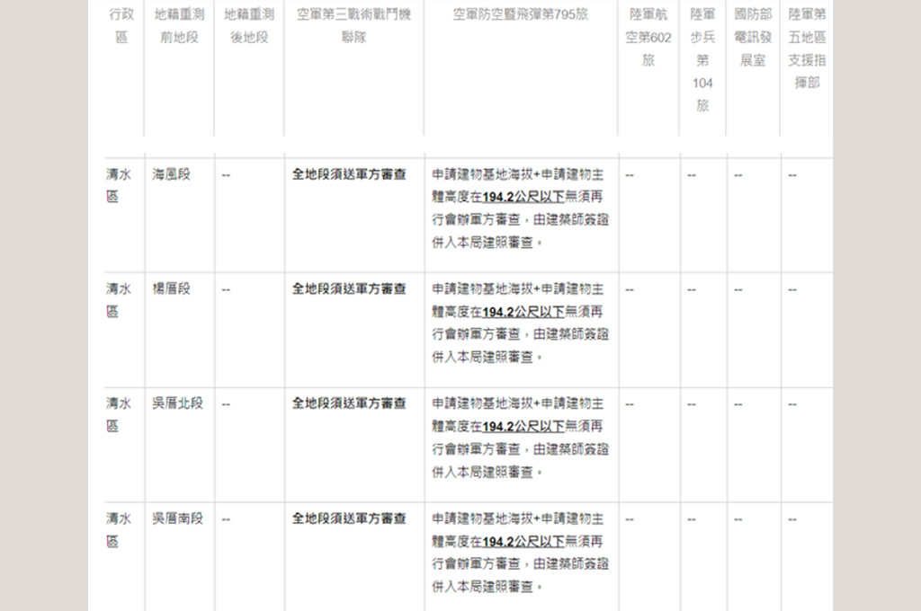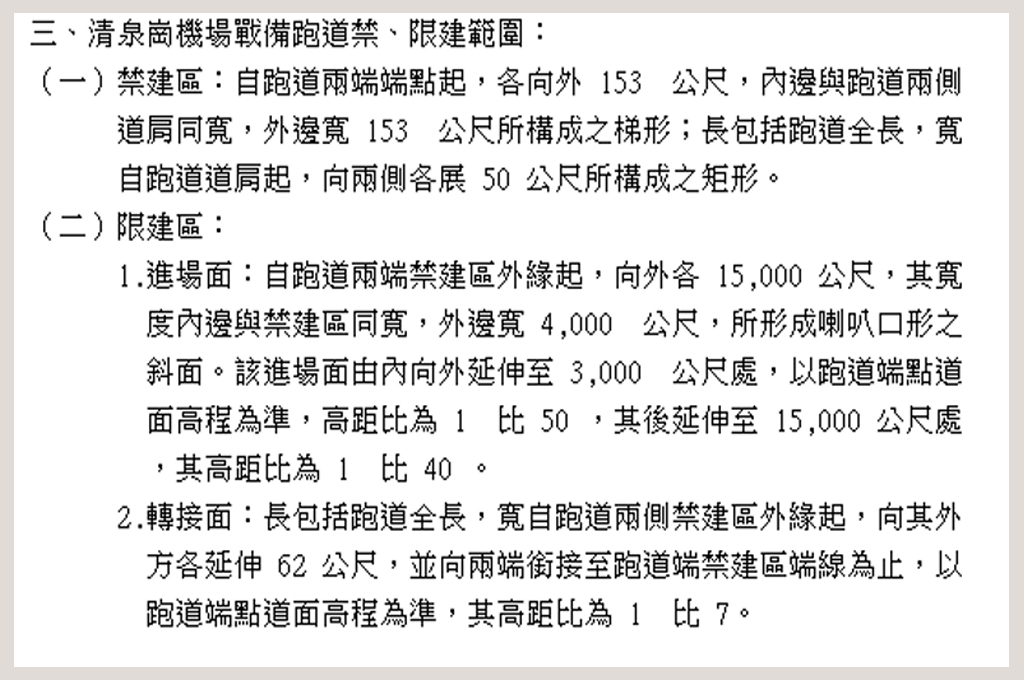 再根據2017年5月22日國防部公布的〈重新公告「臺中清泉崗機場重要軍事設施管制區」及其禁建限建範圍〉,其中提到「禁建區」是從跑道往外延伸300到150公尺不等。以本案來說,開發範圍幾乎都不在「禁建區」內。「限建區」則從「禁建區」再往外延伸1.5公里,本案距離機場約1.2公里,只有小部分重疊。