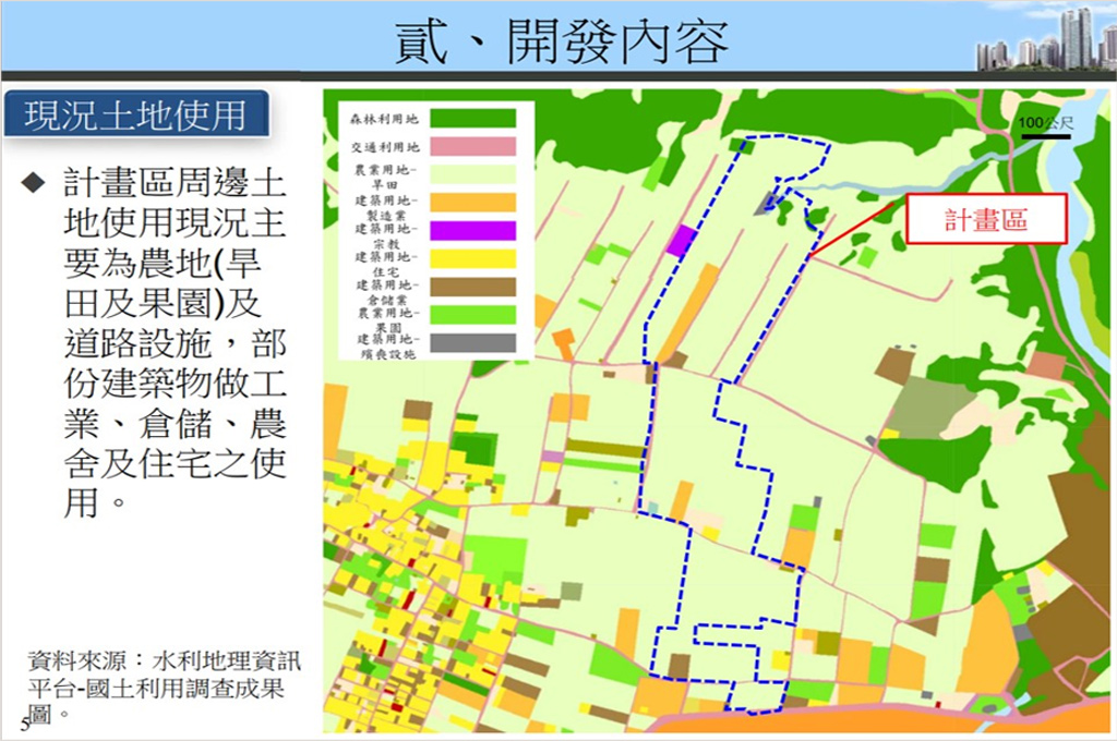 從「創利」提供的環評簡報資料中可知,計畫區呈現詭異的不規則形狀(下圖藍色虛線),堪稱台中版的「傑利蠑螈」。也就是說,顏家土地收購到哪裡,計畫區就怎麼畫。收購不到的土地,就被挪到計畫區之外。