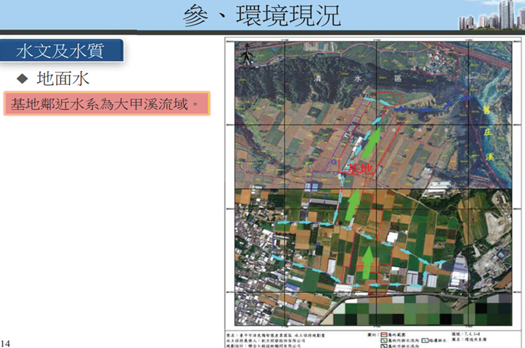 行政院農業委員會農田水利署臺中管理處:園區地勢是由南向北遞減,其放出之廢流水終將排入北側舊庄溪而進入大甲溪流域,因大甲溪下游尚有本處五福圳,高美圳、虎眼一、二等圳農業灌溉用水取水口,建請園區之放流水符合灌溉水質基準值以確保農業灌溉用水水質。