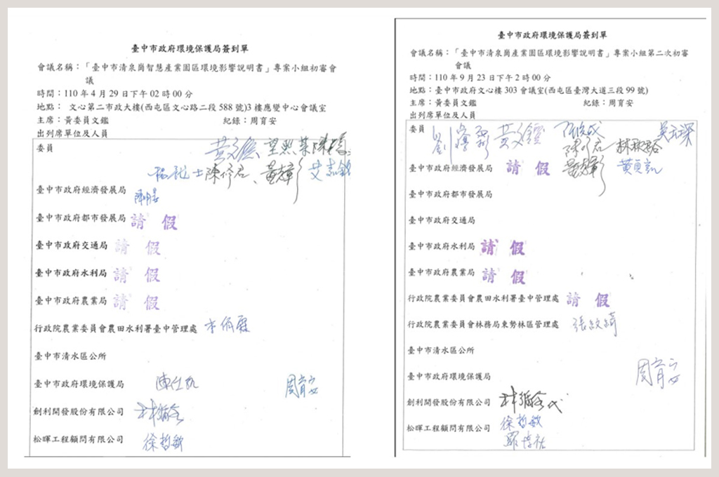 如上圖所示,兩次環評初審會議,一次在4月29日,第二次在9月23日,重要的台中市府官員如都發局、交通局、水利局、農業局……竟然通通請假!局長沒來,副局長或職務代理人也不見人影!22公頃的重要開發案,台中市府竟然裝死閃人。