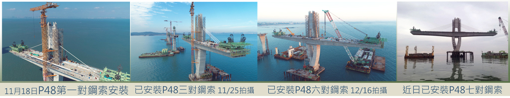 繼主橋基礎及橋塔完成後,上構預鑄節塊吊裝是目前最重要的關鍵工序,橋面正逐步往外拓展,主橋五塔六跨共110條(每塔11對)鋼索,第一對鋼索於今年11月18日在金門縣楊縣長的共同見證下安裝完成,預定將於12月底完成第一塔(P48)索力結構系統,這意謂著金門大橋完成四個關鍵工項的最後一塊技術拼圖。