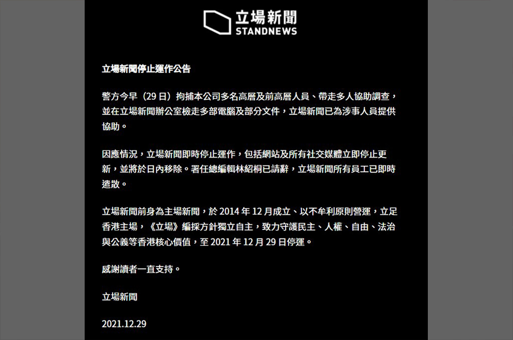 公告聲明,《立場新聞》前身為《主場新聞》於2014年12月成立、以不牟利原則營建,立足香港主場, 立場編採方針獨立自主,致力守護民主、人權、自由、法治與公義等香港核心值,至2021年12月29日停運,感謝讀者一直支持。