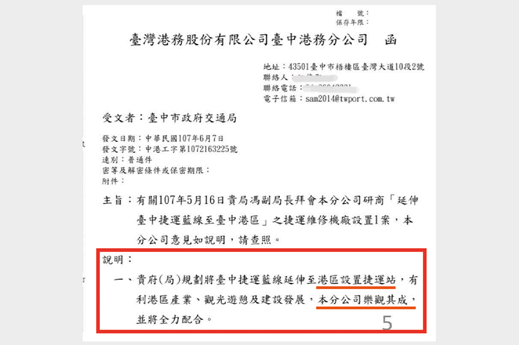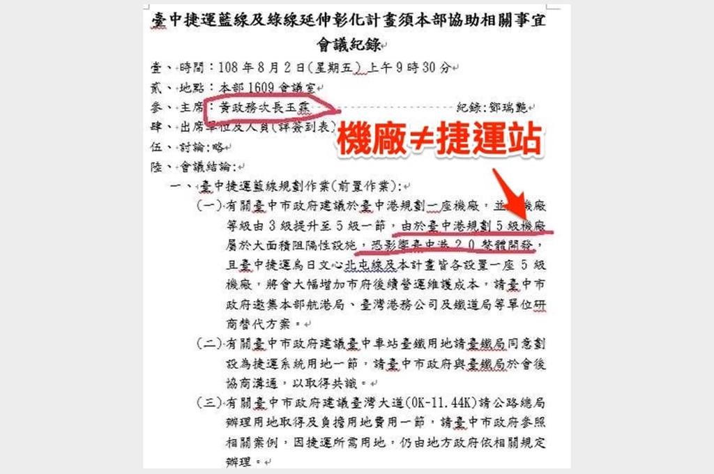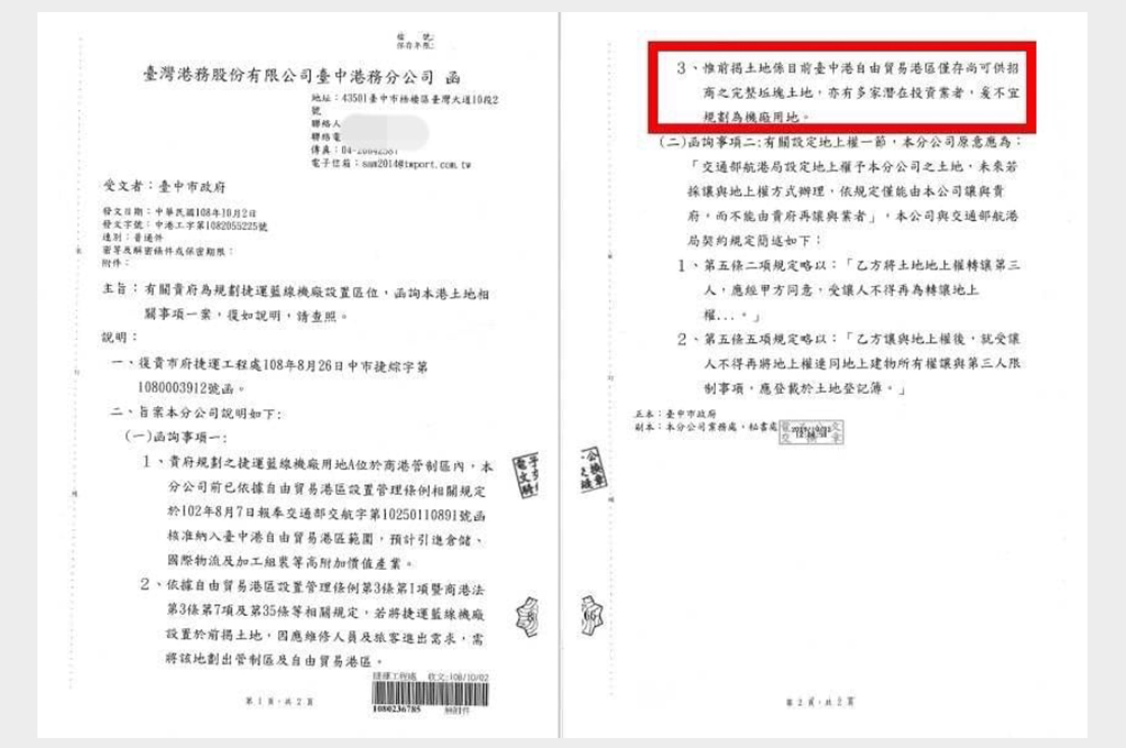卓冠廷列舉,2018年6月7日,港務公司回文表示對於設置捷運站,港務公司樂見其成並將全力配合;2019年8月2日,國民黨公布的會議紀錄,寫得很清楚,交通部對於盧市府把台中港機廠規劃為五級機廠,土地面積需求大,希望各單位研商替代方案;2019年10月2日,港務公司回文表示,捷運維修機廠,可能影響整體完整開發,不宜規劃為「機廠用地」。