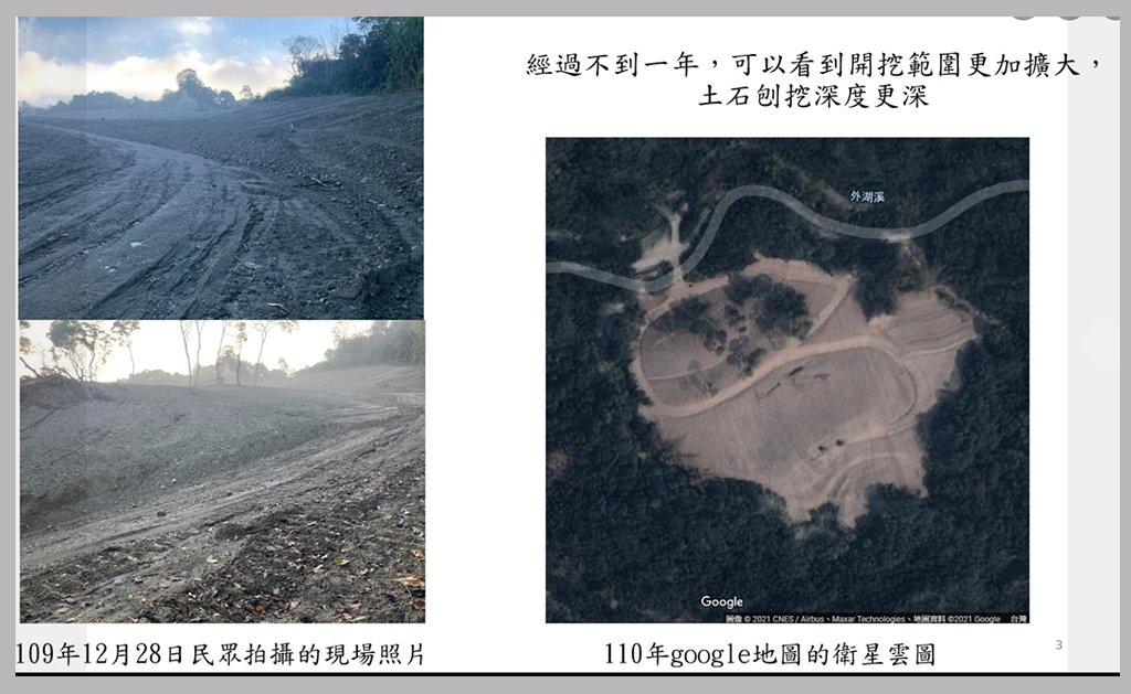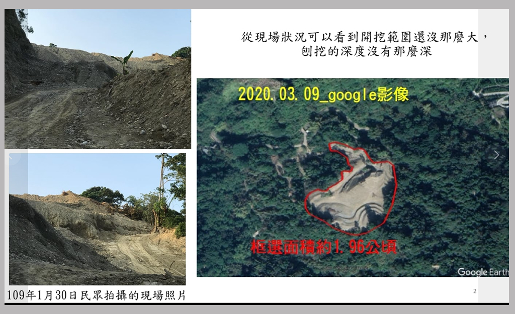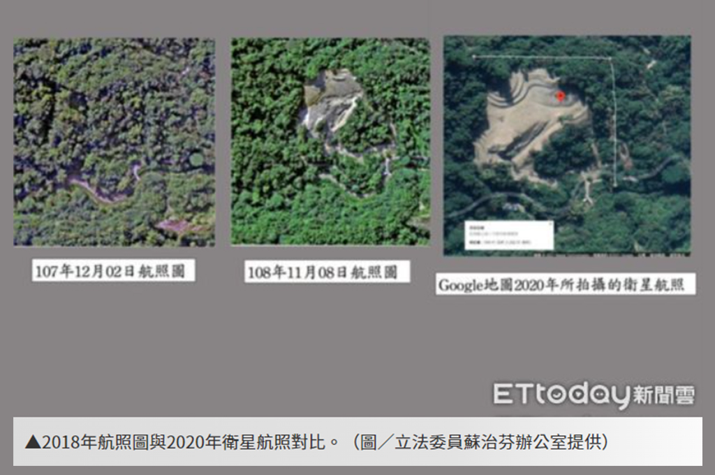 由立委蘇治芬於1/18出示的空照圖與民眾現場拍攝照片可知,從2020年1月30日到2020年12月28日,濫墾持續進行,並未因縣府小規模「裁罰」而停止。