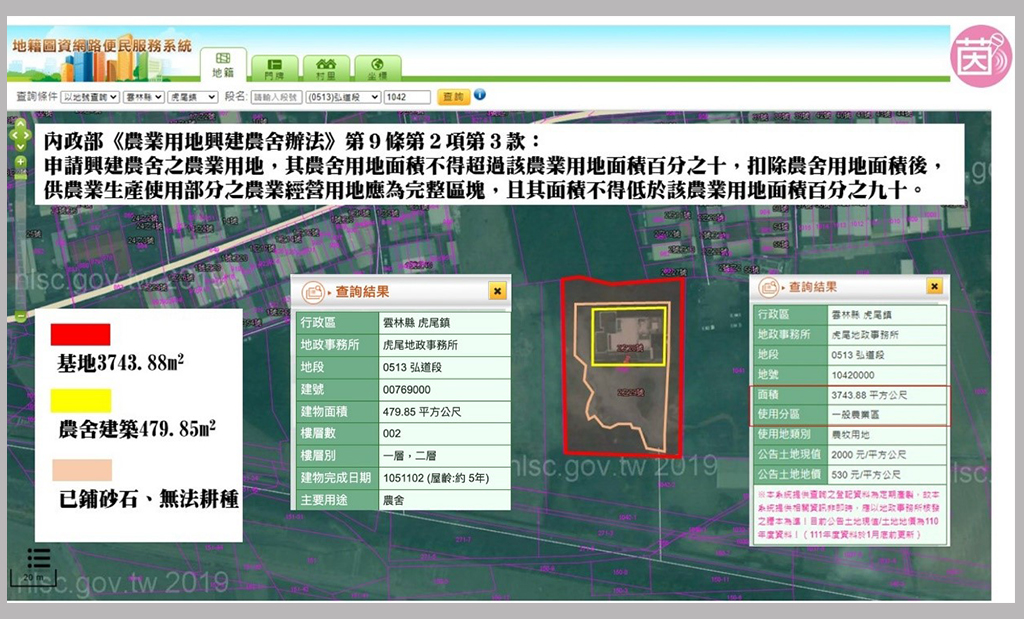 「青埔宮」的土地面積3743平方公尺,登記建築物(農舍)面積479平方公尺,後者明顯超過土地面積10%。更進一步說,張麗善可以辯稱10%是「農舍用地面積」,也就是說兩層樓的農舍面積479平方公尺,占地面積只有一半出頭約250平方公尺,不到10%的限制。
