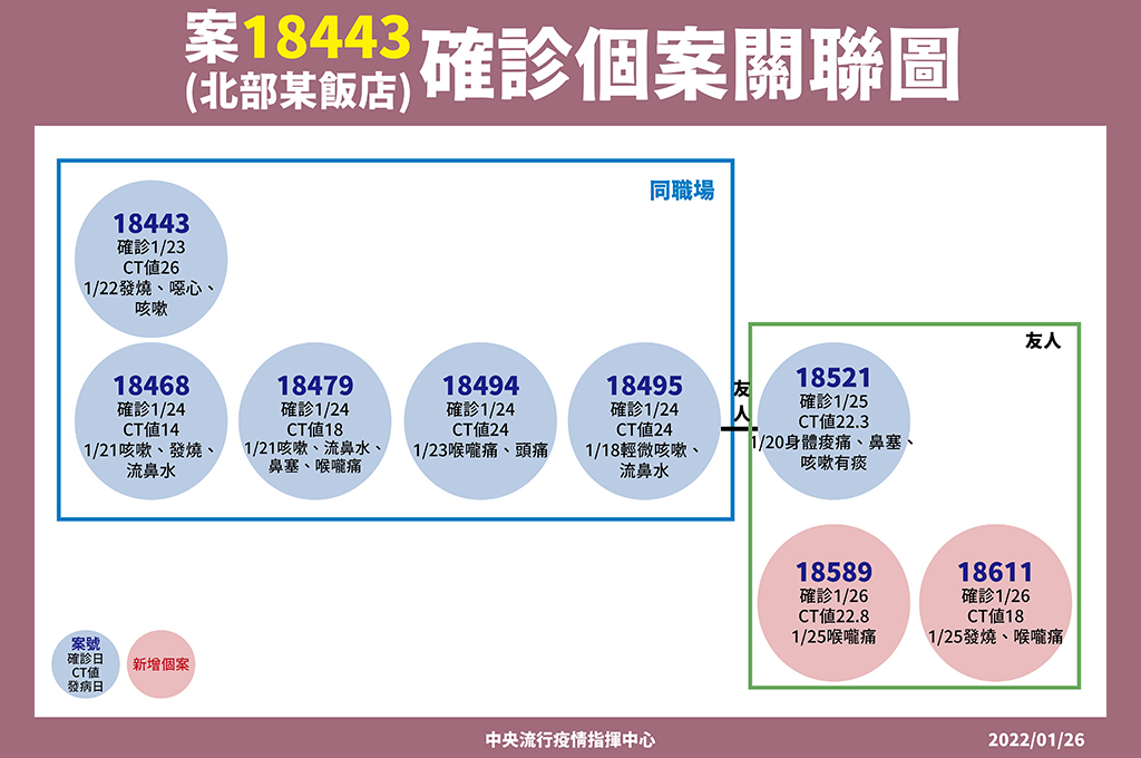 台灣本土疫情爆發,除了桃機、遠雄自貿區、高雄港幾個重點群聚案外,指揮中心今日公布最新基因定序,發現雙北的圓山廚師、房仲關聯案、宜蘭礁溪長榮鳳凰酒店,分別感染的都是不同Omicron變異株。鳳凰酒店昨日新增的確診員工友人(案18521),曾和朋友曾有16人聚會,採檢後又有2人(案18589、18611)確診。房仲(案18375)昨日新增客戶時尚雜誌編輯(案18518)確診,加上先前在火鍋店聚餐的蘆洲友人(案18397),今日疫調後同時段吃火鍋的顧客也確診,列為案號18590,為不同桌用餐的幼稚園老師。