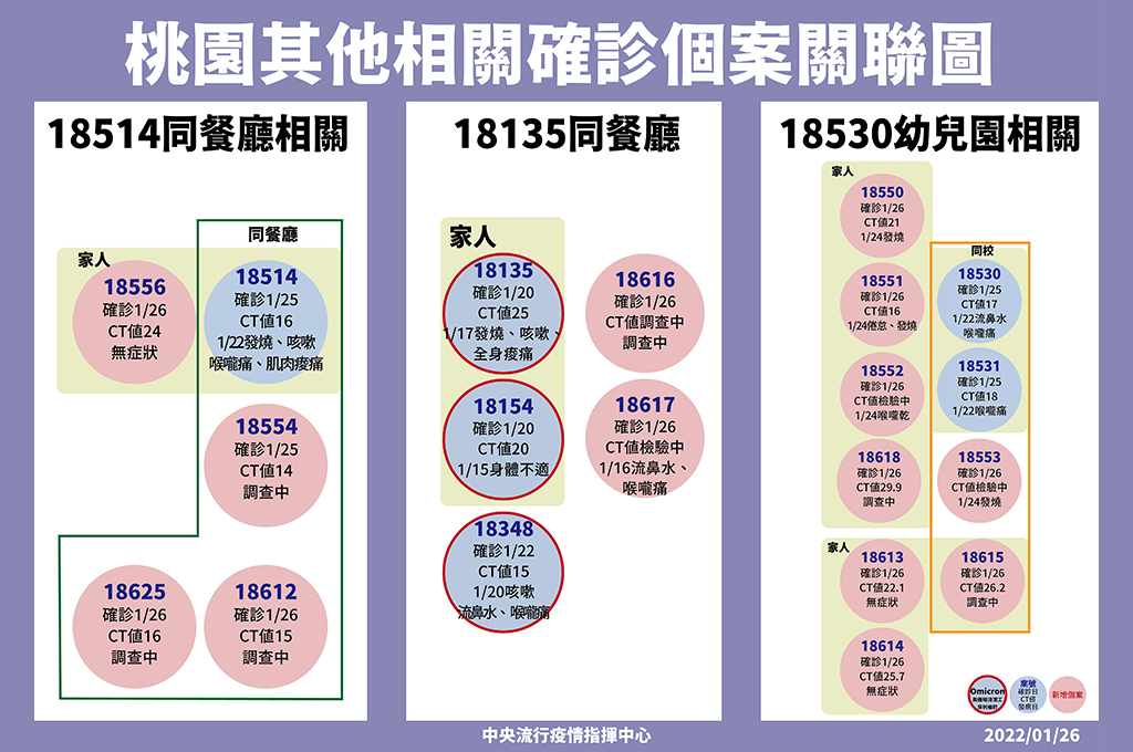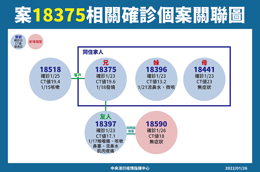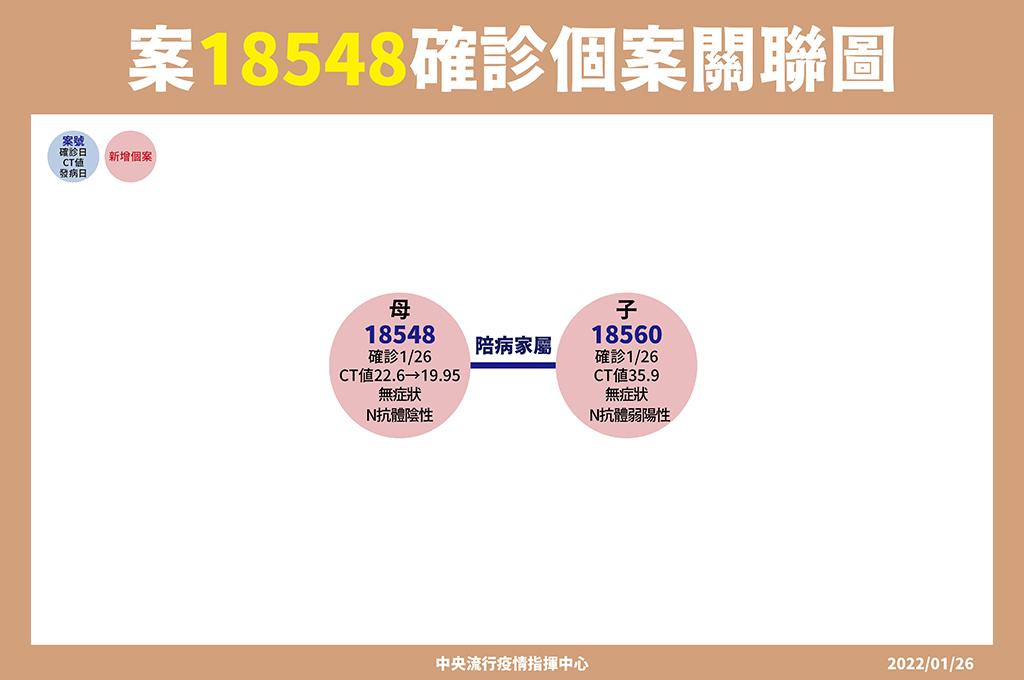 至於亞東醫院2例為70多歲的母親(案18548)與50歲兒子(案18560),母親於1月4日咳嗽住醫院、1月18日轉入一般病房、1月25日全院採檢,PCR陽性、Ct值22.6。1月26日二採Ct值19.95,轉入專責病房隔離治療。兒子已完成2劑疫苗接種,母親1月4日住院陪病,1月25日全院採檢,快速PCR陽性、Ct值28,收治專責病房隔離治療。由於兒子陪病後便無上班工作,足跡不多,僅醫院附近的醫材用品店、小吃店,已匡列相關接觸者安排採檢,目前同住家人採檢結果均為陰性,母親則因為住院期間皆未出病房,並未有足跡。