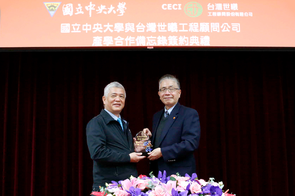 (台灣世曦董事長施義芳(左)與國立中央大學校長周景揚(右)互贈簽約紀念品)