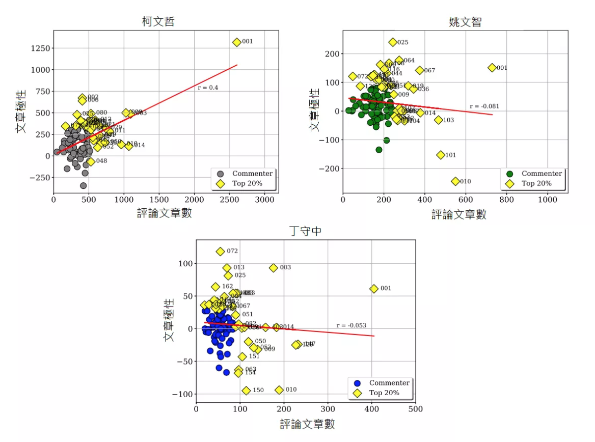 (圖一:候選人相關文章之前100活躍評論者,在評論文章數量與極性之分布)