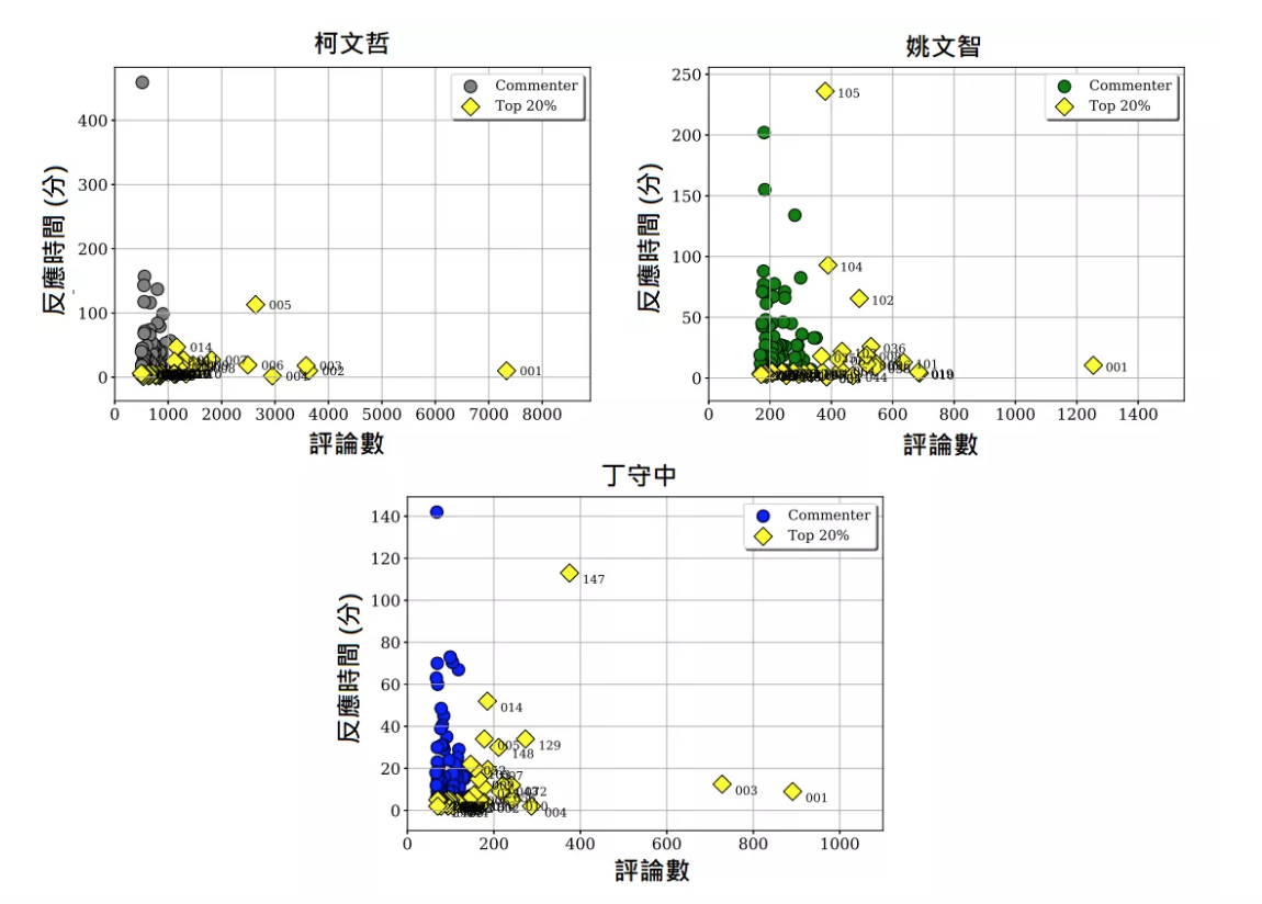 (圖二:候選人相關文章之前100活躍評論者,在評論文章數量與文章反應時間之分布)