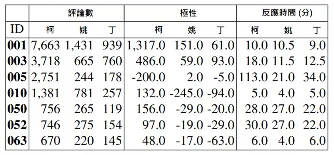 1、柯文哲能夠讓使用者積極表態,且這些使用者傾向對其討論文章持正面極性。相反的,姚文智及丁守中則讓使用者給予中立甚至負面極性。