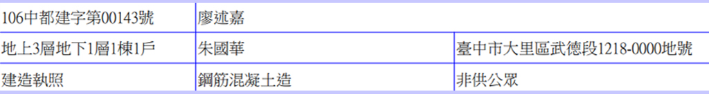 當無殼蝸牛的盧廖二人,還有一大謎團。有個叫做廖述嘉的人(不確定是否同名同姓)2017年擔任起造人蓋了一棟大里透天(如下表)。如果這位就是盧秀燕的先生,那豈不是自己沒房子,卻幫人蓋房子?