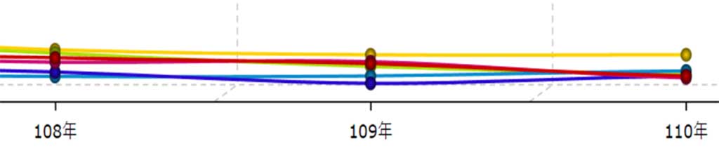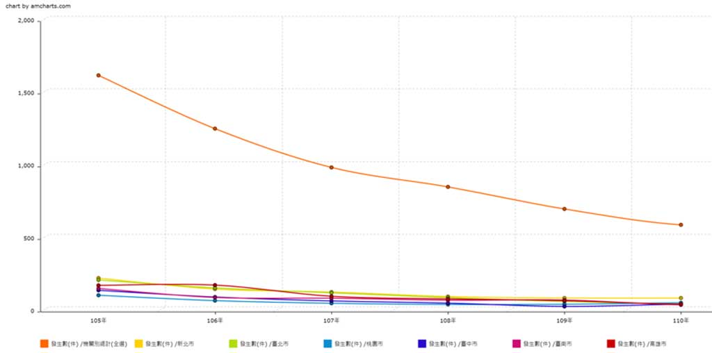 我們把圖放大,新北暴力犯罪的件數(黃線)明顯在六都中下降最少。