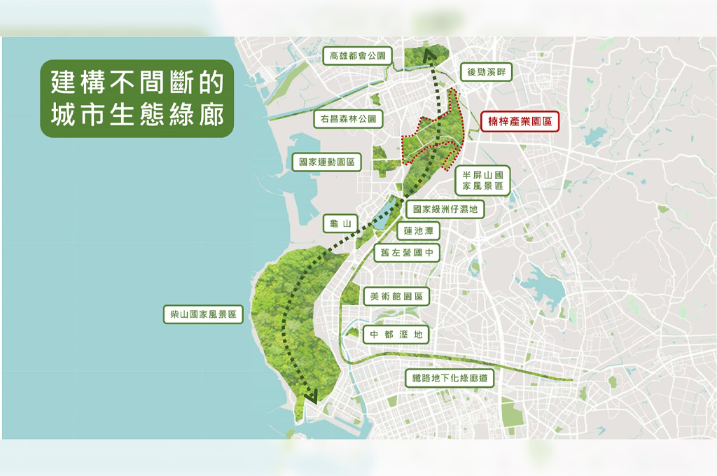 楠梓產業園區劃設有6.8公頃之萬坪公園,未來全期開發後,將透過垂直綠化、生態池、生態廊道串聯,於設廠退縮地營造多樣化之綠化環境,廠房與廠房之間亦規劃綠帶及高密度植栽,藉由法定空地與退縮帶形塑一系列生態綠手指,打造「生態綠廊公園內的半導體園區」,與鄰近社區串接共融共生。並將生態綠廊往北延伸至後勁溪、高雄都會公園,向南銜接半屏山、蓮池潭、鐵路新生綠廊、美術館、中都溼地、愛河流域及柴山,建構綿延完整的都會生態廊帶。