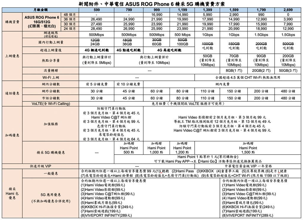 - 有關中華電信ROG Phone 6購機資費方案優惠相關內容,將依網站公告為主。