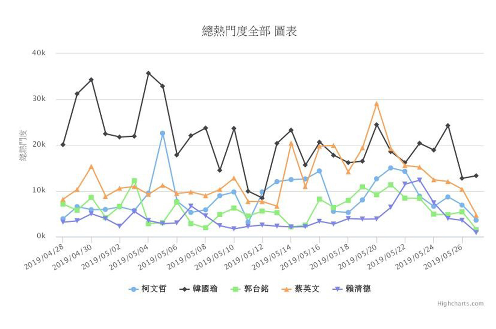 聲量王的韓國瑜在黃婕的質詢時聲量達到最高峰,後續記者詢問柯文哲對「韓國瑜備詢」的事件看法,甚至不少網友拿「柯韓」的施政比較,讓柯文哲也因黃婕事件而稍有反彈,其聲量下降之後,還看不出有回檔的趨勢。可看出韓國瑜雖然平均處於高點,但自五月中之後相對聲量的比較優勢已經開始和蔡英文互有交錯,意即其話題性與影響力在某些時刻高於韓國瑜。