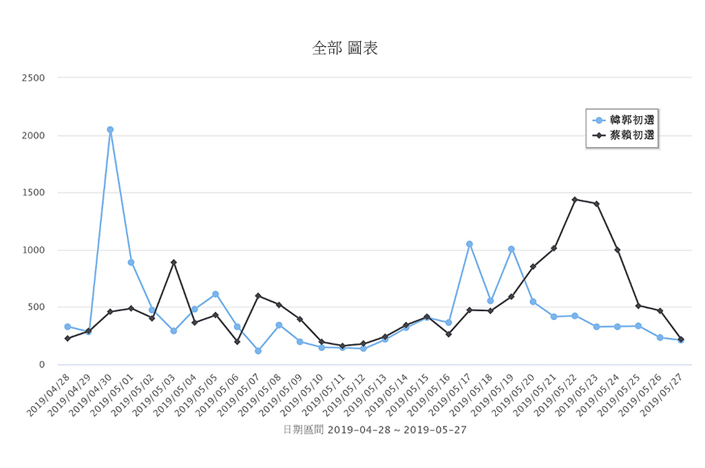 國民黨的初選出現在郭台銘及韓國瑜之間爭奪,朱立倫與王金平已經嚴重邊緣化,而民進黨在蔡英文及賴清德之間做比較,會發現在總聲量上呈現伯仲的對抗,4月底在「吳韓會」後有一波高聲量的影響,總體上呈現民進黨略高的情況。特別是522的中執會的戲劇化的劇情,讓民進黨初選的聲量皆會明顯高於國民黨。