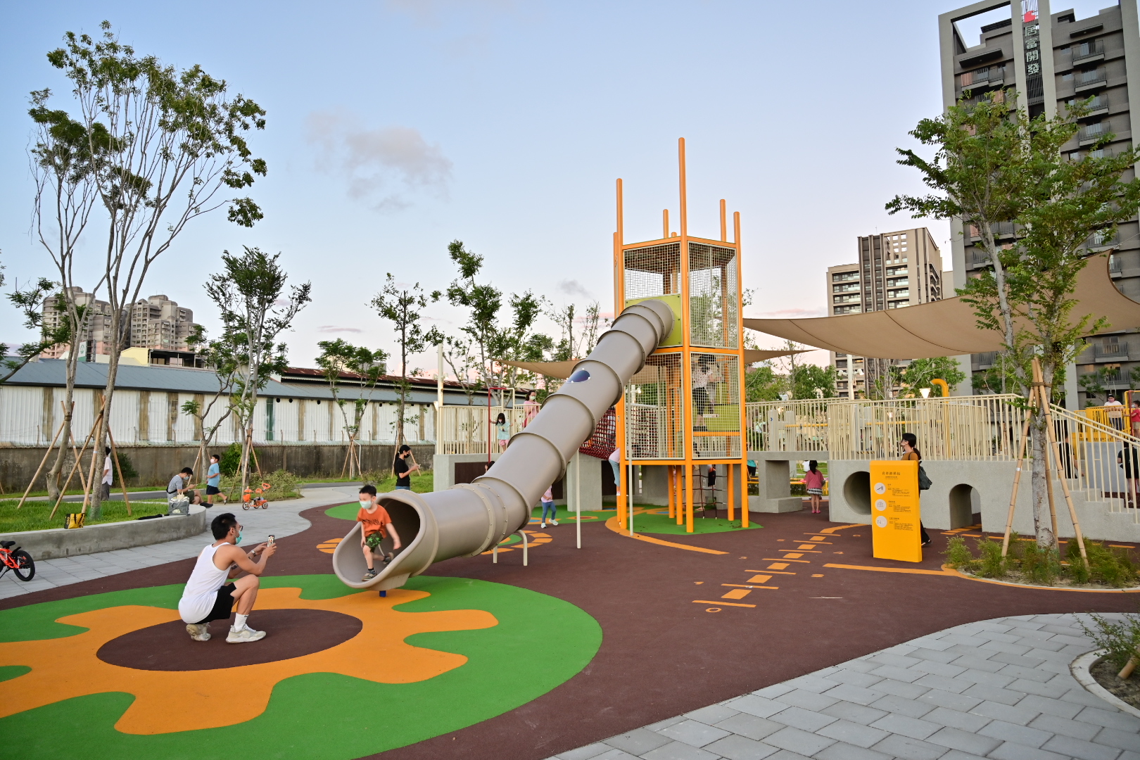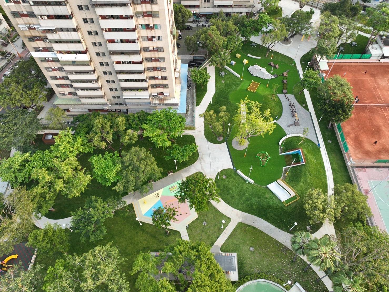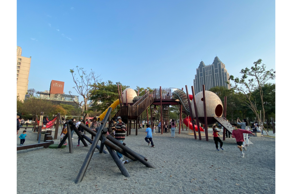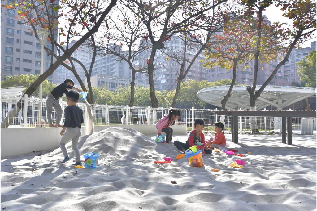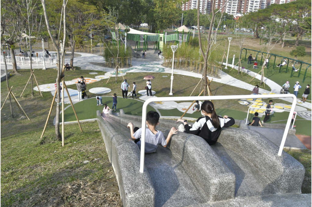蓊鬱的綠樹隨風擺盪,清脆的鳥鳴此起彼落,伴隨著孩童在蹺蹺板上的嬉鬧、在鞦韆上的驚呼,以及溜滑梯上的歡騰;不遠處的涼亭,則停留著覓得一絲清閒的家長與乘涼的社區居民。